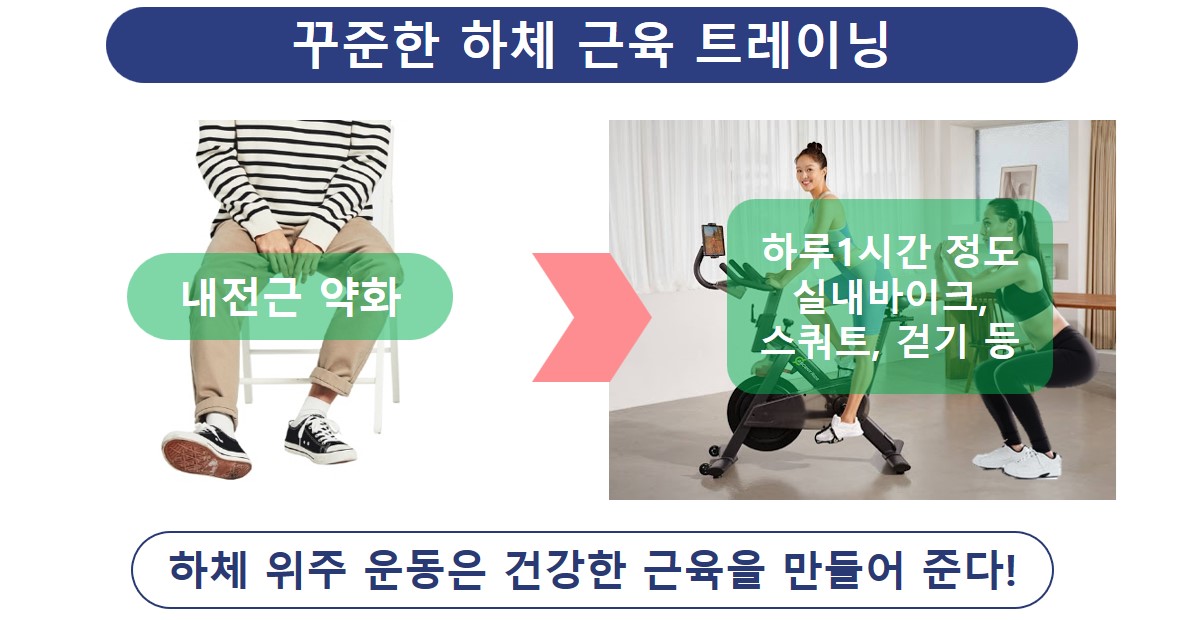 내전근을 강화하기 위해서는 하루 한시간 정도의 하체 위주로 실내 바이크나 스커트, 걷기 등의 운동을 꾸준히 해 주어야 합니다. 하체 중심의 꾸준한 운동은 우리 몸에 건강한 근육을 만들어 줄 수 있습니다.