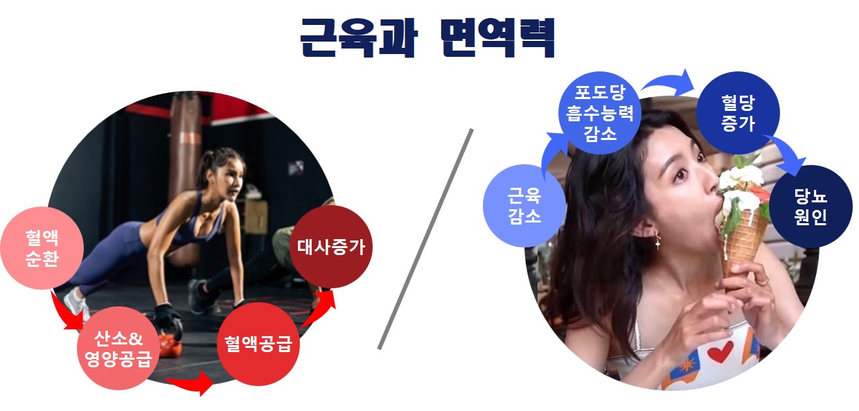 이 작용으로 점점 대사가 올라가서 젊고 건강한 몸 만들기로 이어지게 되는 것입니다. 그런데, 근육이 줄어들게 되면 포도당을 흡수하는 능력이 떨어지게 되고 혈당이 높아지게 되어 여러가지 질환, 특히나 당뇨이 주된 원인이 되게 됩니다.