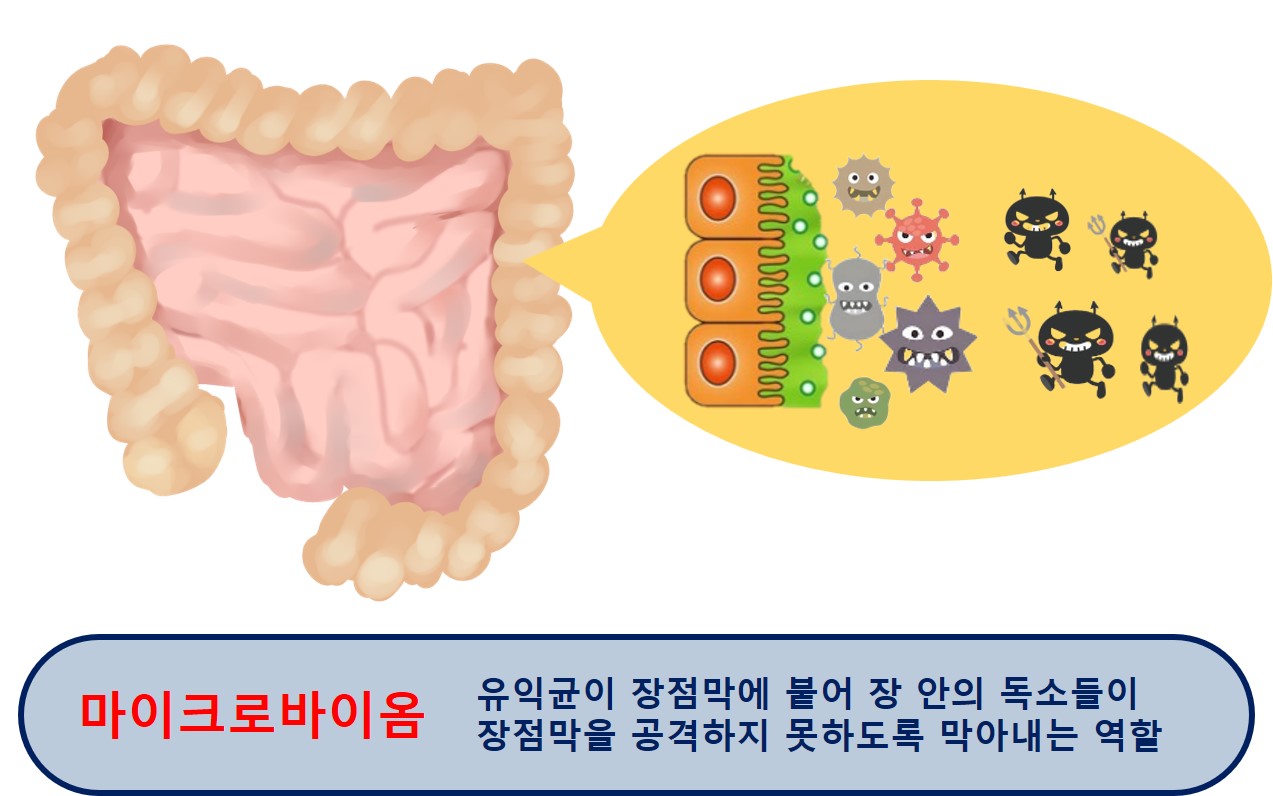 마이크로바이옴의 중요한 역할 중 하나는 유익균이 장점막에 잘 붙어있어서 장 안에 있는 여러가지 독소들이 장점막을 공격하지 못하도록 막아내는 역할을 하는 것입니다.