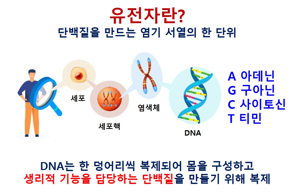 DNA는 아데닌, 구아닌, 사이토신, 티민 등 4가지의 염기가 줄지어서 이어진 긴 실 가닥 형태를 하고 있습니다. 이 신비로운 실가닥인 DNA에서 특정 부분이 복사되어서 우리 몸을 만들고 여러 기능을 담당하는 단백질이 만들어 집니다. 이렇게 각종 단백질을 만드는 DNA의 일부를 우리는 유전자라고 부릅니다.