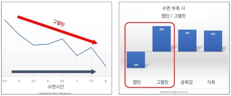 그러나 수면이 부족하게 되면 식욕 억제 호르몬인 렙틴은 감소하고 식욕 촉진 호르몬인 그렐린은 증가를 하게 되어서 음식을 더 찾게 되는 것입니다.