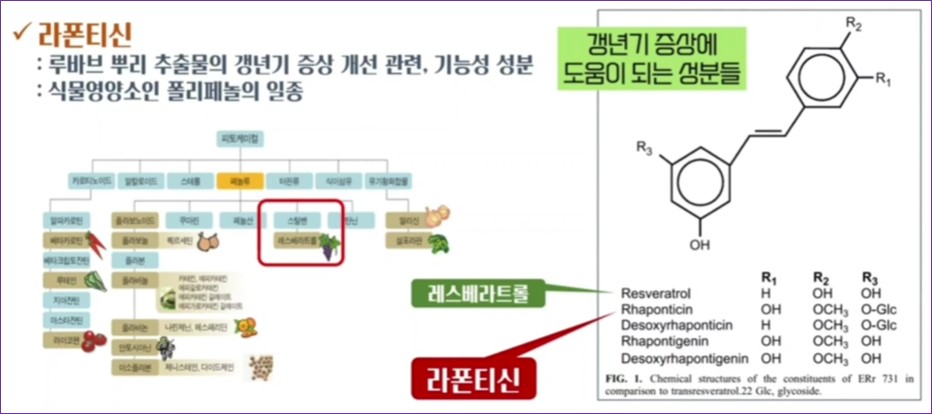 루바브 뿌리 추출물의 갱년기 증상 개선 관련 기능성 성분은 라폰티신 이라는 성분입니다. 식물 영양소인 폴리페놀의 일종이고 같은 종류의 식물 영양소로 포도의 껍질에 함유되어 있는 레스베라트롤 이라는 성분이 있습니다. 라폰티신과 레스베라트롤은 화학적 구조가 매우 유사하고, 인체내에서 비슷한 작용을 합니다. 그리므로, 레스베라트롤 역시 갱년기 증상 개선에 도움이 된다고 할 수 있겠습니다.