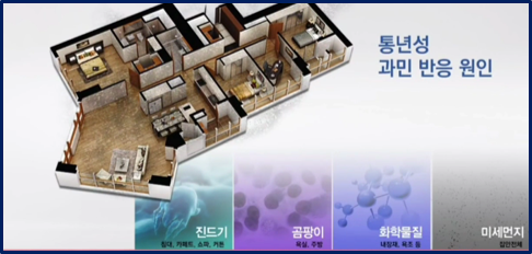 통년성 과민반응의 경우 1년 내내 지속되는 과민반응으로 그 원인은 개인의 환경에 따라 차이는 있으나 집안에서 일상생활 중 빈번하게 접촉하는 생활 용품 등에 기인합니다. 특히 침구류에 서식하는 집먼지 진드기, 욕실, 주방, 다용도실 등 습도가 높고 관리가 되지 않는 곳의 곰팡이, 집안 인테리어 등에서 노출되는 여러가지 화학물질, 반려동물의 털과 배설물 등이 통년성 과민반응의 원인입니다.