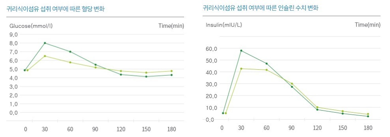 식이섬유도 역시 중요한데 식이섬유는 소화기관에서 수분을 흡수하면서 당분을 함께 흡착 배출시키기 때문에 혈당관리에 도움이 됩니다. 특히 규리에 있는 식이섬유가 식후 혈당 및 인슐린 수치를 감소시키는 것을 위의 그래프를 보시면 확인할 수 있습니다.