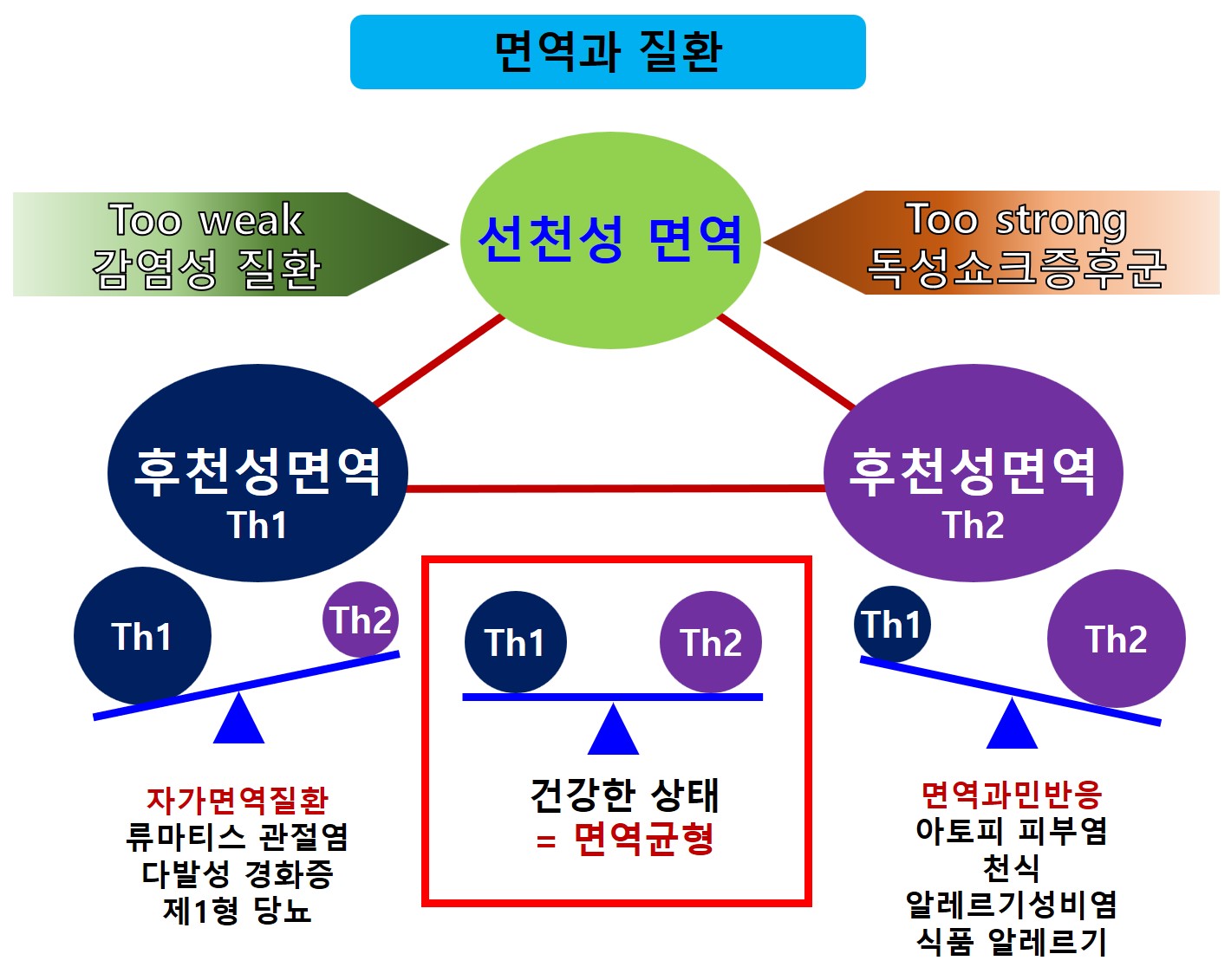 그래서 Th1과 Th2, 즉 세포성 면역과 체액성 면역의 균형이 중요하며, 선천면역과 후천면역의 균형도 중요합니다.