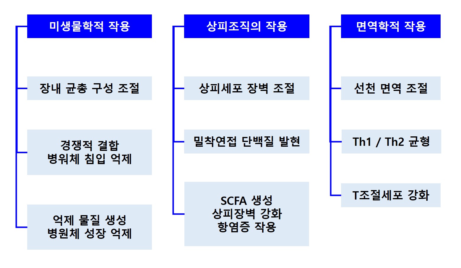 프로바이오틱스의 면역 관련 기능은 세가지 기전으로 설명이 됩니다. 우선 미생물학적 작용인데, 장내에서 병원균들과 경쟁하고 병원체에 침입을 막아주며, 단쇄지방산과 같은 포스트 바이오틱스를 생성해서 유해균을 억제합니다. 그리고 프로바이오틱스는 상피 조직에 작용을 하게 되는데, 밀착 연접, 단백질 발현, 단쇄지방산의 생성을 통해서 상피조직 즉, 장의 점막을 강화시키고 염증을 억제하는 역할을 하게 됩니다.