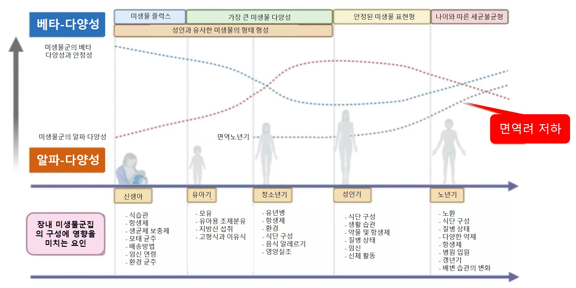 위 그림은 나이에 따른 장내 마이크로바이옴의 다양성의 변화를 보여줍니다. 나이가 들어가면서 마이크로바이옴의 다양성이 감소하게 되는데, 이는 면역력의 저하로 이어지게 됩니다. 마이크로바이옴의 알파 다양성이 감소하면 면역력이 떨어지는데, 알파다양성은 장내 유익균이 얼마나 많은 종류가 존재하는가를 나타내는 지표입니다.