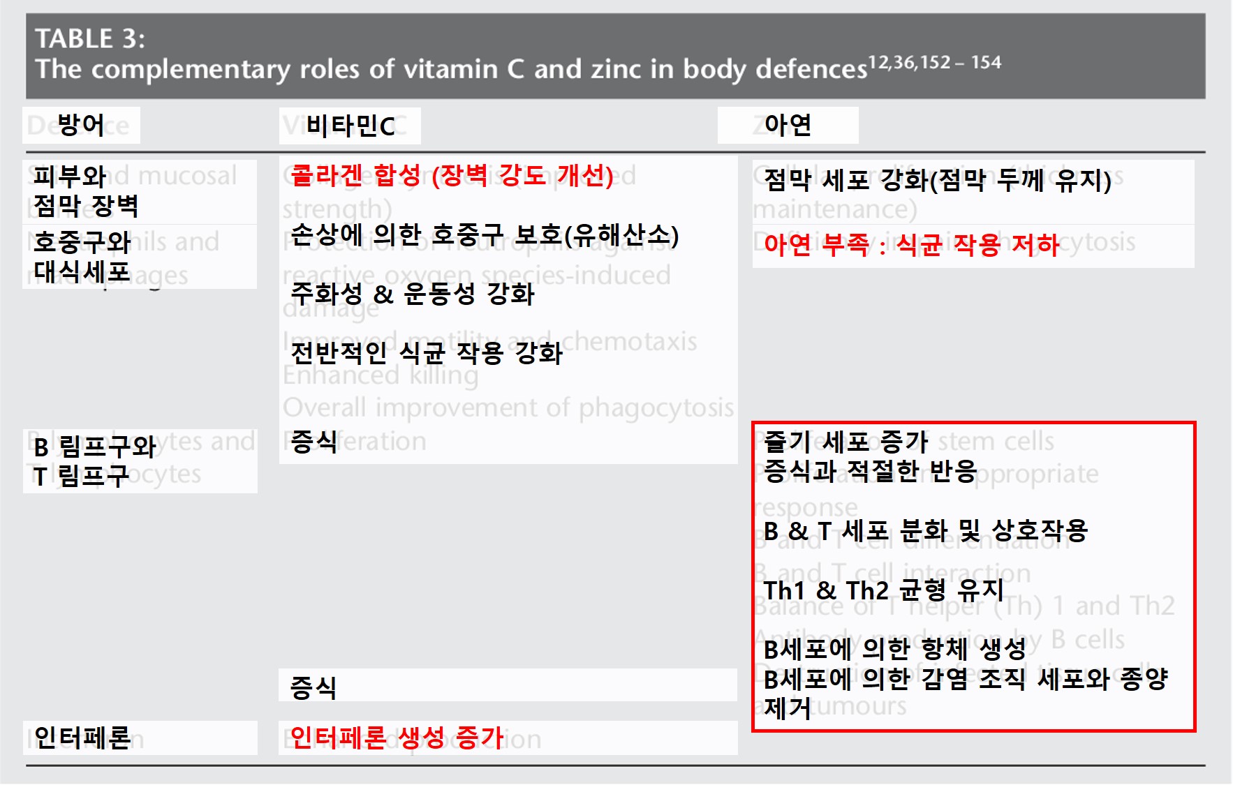 또한 비타민C는 전반적인 식균작용을 강화시키고 강력한 면역기능을 하는 사이토카인, 인터페론의 생성을 증가시킵니다. 아연이 부족하면 식균작용 능력이 떨어지게 되며, B세포, T세포의 분화 및 상호작용, Th1, Th2 면역의 균형 유지 및 B세포에 의한 항체 생성과 감염 조직 세포와 종양을 제거하는데 도움이 됩니다.
